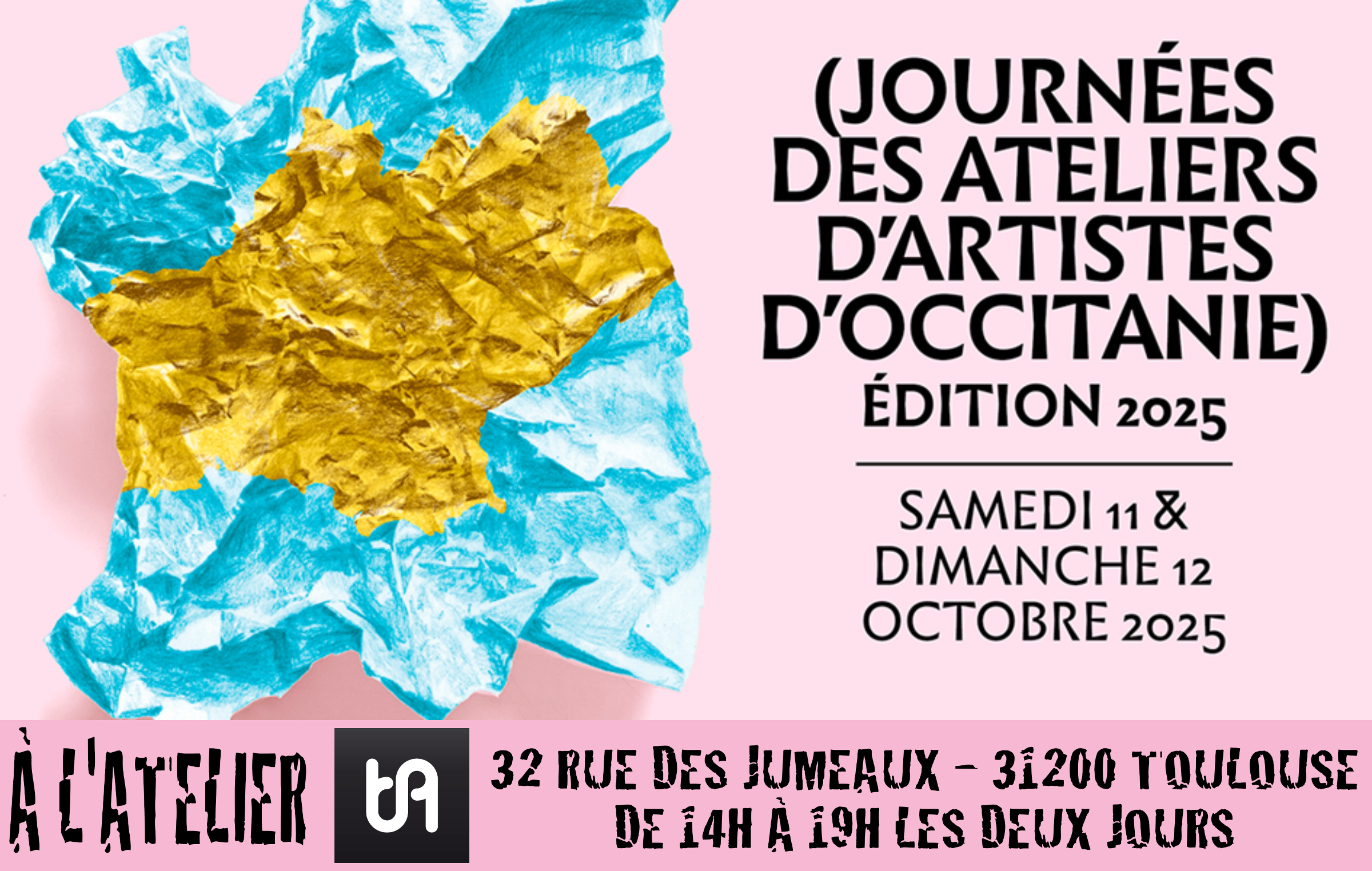Comme pour les éditions précédentes, nous vous proposerons la visite de nos espaces de création, des rencontres avec les artistes de notre lieu de création en commun ainsi que leurs œuvres, mais aussi leur outil de travail singulier qu’est cet atelier collectif et partagé toulousain. L’Atelier TA est situé au bas du Faubourg Bonnefoy, dans un quartier populaire à l’angle des Raisins, un quartier dont nous tenons à exprimer et faire perdurer l’essence ouvrière qui disparait à travers une gentrification est une restructuration sous la pression immobilière. Nous nous trouvons en plein cœur de la capitale occitane, à deux pas du Canal du Midi, n’hésitez pas à nous rendre visite, et même à nous soutenir.